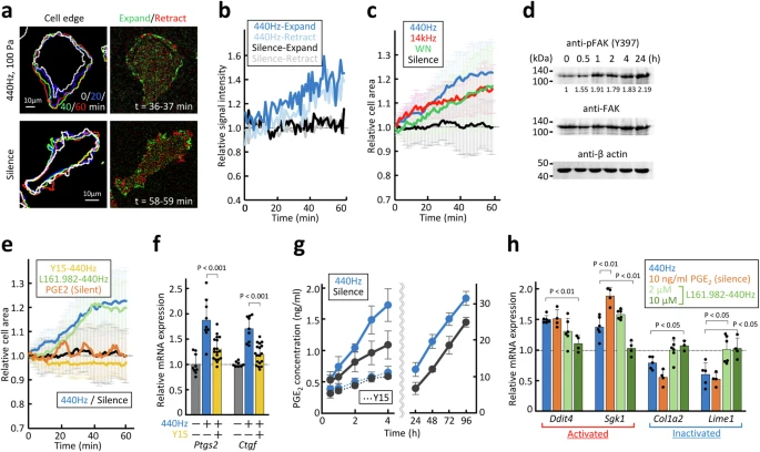 a Живое наблюдение клеток C2C12, экспрессирующих EGFP-Lifeact, при акустической стимуляции синусоидальным звуком частотой 440 Гц при давлении 100 Па. Процедуры обработки изображений описаны на Дополнительном рис. 7. Края клеток в моменты времени 0, 20, 40 и 60 мин наложены белым, синим, зеленым и красным цветом, соответственно. Расширенные и втянутые области через 1 мин показаны зеленым и красным цветом, соответственно. b Изменения во времени относительной интенсивности сигналов расширяющихся/втягивающихся областей при стимуляции 440 Гц (синий/светло-синий) или в тишине (черный/серый). c Изменения во времени относительной площади клеток при стимуляции 440 Гц (синий), 14 кГц (красный) и белым шумом (зеленый) при 100 Па или в тишине (черный). n ≥ 5 для каждого условия, вертикальные столбики указывают +- SD. d Вестерн-блот анализ лизата цельных клеток C2C12, взятого в указанный момент времени после начала непрерывной акустической стимуляции 440 Гц при 100 Па. После блоттинга с антифосфо Y397 FAK-антителом мембрана была снята и повторно блоттирована с анти-FAK-антителом. В качестве контроля нагрузки проводили блоттинг с анти-β-актином. Указана нормализованная интенсивность сигнала фосфорилированного FAK относительно интенсивности сигнала общего FAK. e Временные изменения относительной площади клеток при звуке 440 Гц (синий), тишине (черный), звуке 440 Гц с 2 мкМ Y15 (желтый) и 10 мкМ L161.982 (светло-зеленый) и тишине с 10 нг/мл PGE2 (оранжевый). n ≥ 5 для каждого условия, вертикальные столбики указывают +- SD. f Уровни экспрессии Ptgs2 и Ctgf после 2 ч излучения звука 440 Гц при 100 Па в присутствии (желтый) или отсутствии (синий) 2 мкМ Y15 по сравнению с уровнем в состоянии молчания (серый). Столбики представляют +SD из 3 биологических реплик ≥3 независимых экспериментов, статистическая значимость оценивалась с помощью одностороннего ANOVA с последующим тестом Тьюки HSD. g Количество ПГЕ2, высвобождаемого в культуральную среду, определяли с помощью хемилюминесцентного анализа при непрерывной стимуляции 440 Гц при 100 Па (синий) или молчании (серый) в разные временные точки. Пунктирной линией показаны результаты в присутствии 2 мкМ Y15, добавленного за 1 ч до начала звуковой стимуляции. Столбики представляют +- SD из n ≥ 3. h Ответы четырех генов, чувствительных к звуку, в присутствии 10 нг/мл PGE2 (оранжевый) или 2/10 мкМ L161.982 со стимуляцией 440 Гц (зеленый). Столбики представляют +SD из трех биологических реплик двух независимых экспериментов, а статистическая значимость по сравнению только со звуком 440 Гц (синий) оценивалась с помощью одностороннего ANOVA с последующим тестом Tukeys HSD. Цитирование: Kumeta, M., Otani, M., Toyoda, M. et al. Acoustic modulation of mechanosensitive genes and adipocyte differentiation. Commun Biol 8, 595 (2025). https://doi.org/10.1038/s42003-025-07969-1