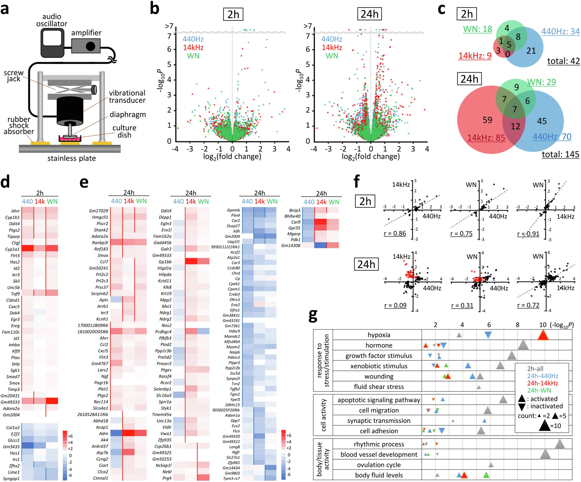 a Схематическое изображение системы прямого звукового излучения, созданной в данном исследовании. b Диаграммы вулканов, показывающие дифференциально экспрессированные гены в клетках C2C12 через 2 ч и 24 ч непрерывного излучения звука 440 Гц (синий), 14 кГц (красный) и белого шума (зеленый) при давлении 100 Па, выявленные с помощью анализа РНК-секвенирования. Образцы анализировали в трех экземплярах для каждого условия. c Диаграммы Венна чувствительных к звуку генов, выявленных с помощью анализа РНК-последовательности. Всего было выявлено 42 и 145 генов после 2 ч и 24 ч непрерывной эмиссии звука частотой 440 Гц (синий), 14 кГц (красный) и белого шума (зеленый) при давлении 100 Па соответственно. d Тепловая карта 33 активированных и 9 инактивированных генов после 2 ч эмиссии звука. Положительные и отрицательные изменения в разах показаны на шкале от красного к синему. Боковые линии указывают на статистическую значимость (P < 0,05). e Тепловая карта для генов, чувствительных к звуку, после 24 ч звукового излучения, показана так же, как и в (d). f Корреляции значений log2 генных ответов с различными звуковыми паттернами. Гены, которые противоположно реагировали на звук 440 Гц и 14 кГц в течение 24 ч, отмечены красным цветом. g Биологические активности, на которые существенно влияет звуковое излучение, выявлены в результате анализа аннотации генов, проведенного с помощью Metascape. Перечислены пути с высокой статистической значимостью (-log10P > 5). Цитирование: Kumeta, M., Otani, M., Toyoda, M. et al. Acoustic modulation of mechanosensitive genes and adipocyte differentiation. Commun Biol 8, 595 (2025). https://doi.org/10.1038/s42003-025-07969-1