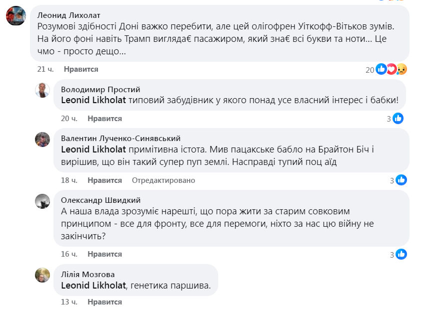 «Умственные способности Дони трудно перебить, но этот олигофрен Уиткофф-Витьков сумел. На его фоне даже Трамп выглядит пассажиром, который знает все буквы и ноты... Это чмо – просто нечто...», - сообщил «эксперт» по умственным способностям Леонид Лихолат.