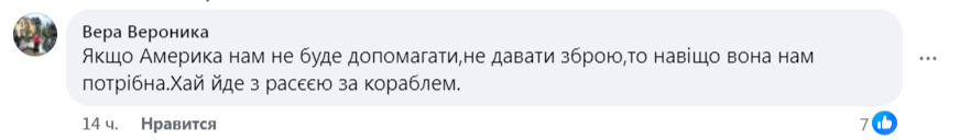 «Если Америка нам не будет помогать, не давать оружие, то зачем оно нам нужно. Пусть идет с Рассеей за кораблем», - заявил еще один поп Гапон в юбке под ником Вера Вероника.