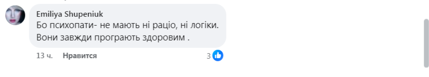 «Потому что психопаты не имеют ни рацио, ни логики. Они всегда проигрывают здоровым», - вынесла вердикт Emiliya Shupeniuk. Прекрасное, кстати, замечание. И было бы совсем прекрасно, если бы автор изрекал его, глядя в зеркало, и взирая заодно на своих соплеменников по разуму, а не на тех, до кого им дальше, чем на дирижабле до звезды Альдебаран. (Стиль авторов сохранен - ред.)