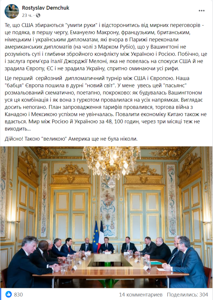 «То, что США собираются "умыть руки" и отстраниться от мирных переговоров - это благодаря, в первую очередь, Эмманюэлю Макрону, французским, британским, немецким и украинским дипломатам, которые вчера (речь о 17 апреля - ред.) в Париже убедили американских дипломатов (во главе с Марком Рубио, что в Вашингтоне не понимают сути и глубины вооруженного конфликта между Украиной и Россией. Косвенно, это и заслуга премьера Италии Джорджи Мелони, которая не повелась на соблазны США и не изменила Европе, ЕС и не изменила Украине, ловко обходя все рифы», - заявил Демчук.