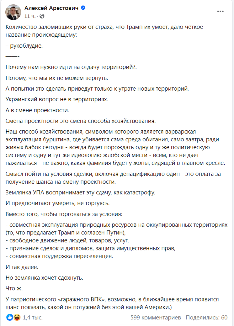 «Землянка УПА воспринимает эту сдачу, как катастрофу. И предпочитают умереть, не торгуясь. Вместо того, чтобы торговаться за условия <...> Но землянка хочет сдохнуть. Что ж. У патриотического «гаражного ВПК», возможно, в ближайшее время появится шанс показать, какой он потужный (мощный – рус.) без этой вашей Америки», - подчеркнул Арестович.