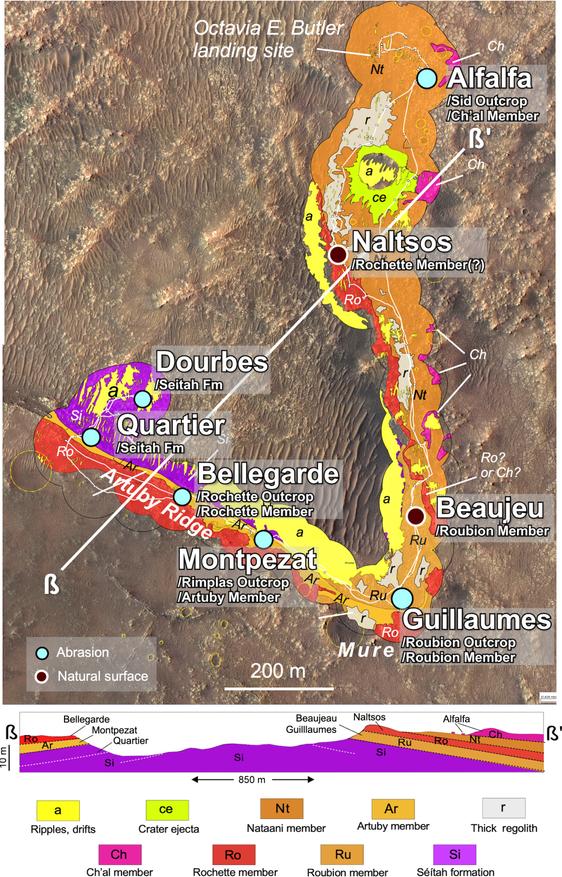 Представьте себе геологический разрез дна кратера. Ученые, используя рентгеновский глаз марсохода — инструмент PIXL, — смогли различить там как минимум два типа вулканических пород, сформировавшихся, по-видимому, в разное время или из разных источников магмы.