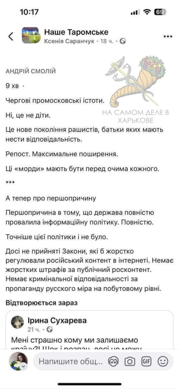 «Мощный парень! С характером вырос. Дал отпор бандеровке, которая беснуется от русского языка. И главное, как мальчишка спокоен и уверен. Свидомая пытается его брать "на слабо", но он не ведётся. Это же надо каким больным животным быть, чтобы выскочить на улицу разбираться? Закрой окна и не слушай», — поддерживает ребенка другая часть населения Украины.