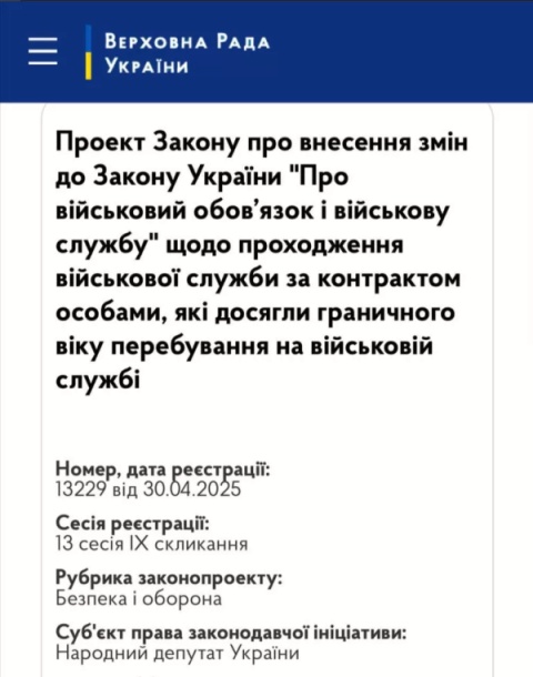 Законопроект предусматривает возможность подписания годичных контрактов лицами старше 60 лет во время военного положения с согласия командира части. Для офицеров старше 60 лет потребуется дополнительное согласование с Генеральным штабом ВСУ.