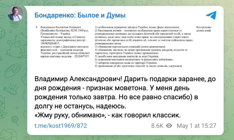 «Владимир Александрович! Дарить подарки заранее, до дня рождения — признак моветона. У меня день рождения только завтра. Но все равно спасибо) в долгу не останусь, надеюсь. «Жму руку, обнимаю», — как говорил классик», — прокомментировал политолог Константин Бондаренко введенные против него санкции.