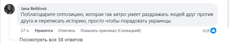 «Поблагодарите оппозицию, которая так хитро умеет настраивать людей друг против друга и переписать историю, просто чтобы порадовать украинцев», - отметила, в частности, Jana Belišová.