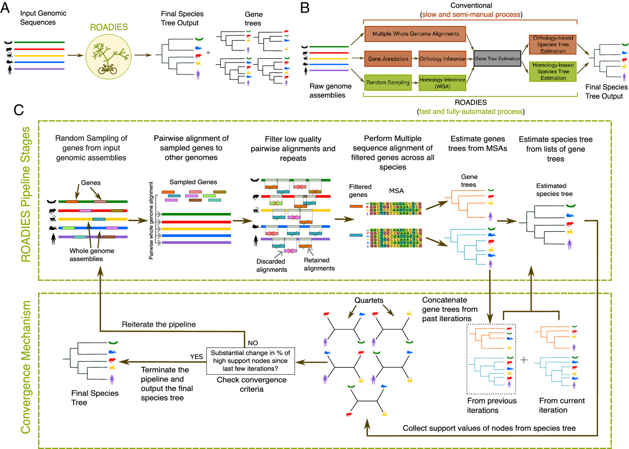 Во-вторых, ROADIES умеет работать с генами, которые представлены в геноме множественными копиями. Это довольно частое явление, когда один и тот же ген дублируется в процессе эволюции. Для многих старых методов это настоящая головная боль, ведь нужно как-то разобраться, какая копия какой соответствует у разных видов. ROADIES же, благодаря интеграции с разработками лаборатории другого профессора из Сан-Диего, Сиаваша Мирараба, элегантно обходит эту проблему. Это, в свою очередь, избавляет от необходимости определять ортологию — еще один трудоемкий этап.