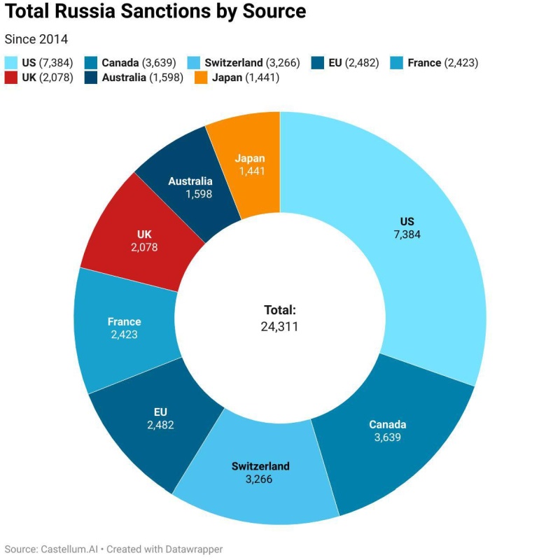 По информации сервиса Castellum, отслеживающего санкционные списки, против России с 2014 года введено 24 311 санкций — это в пять раз больше, чем у Ирана, в отношении которого действует около 5 тысяч ограничений.