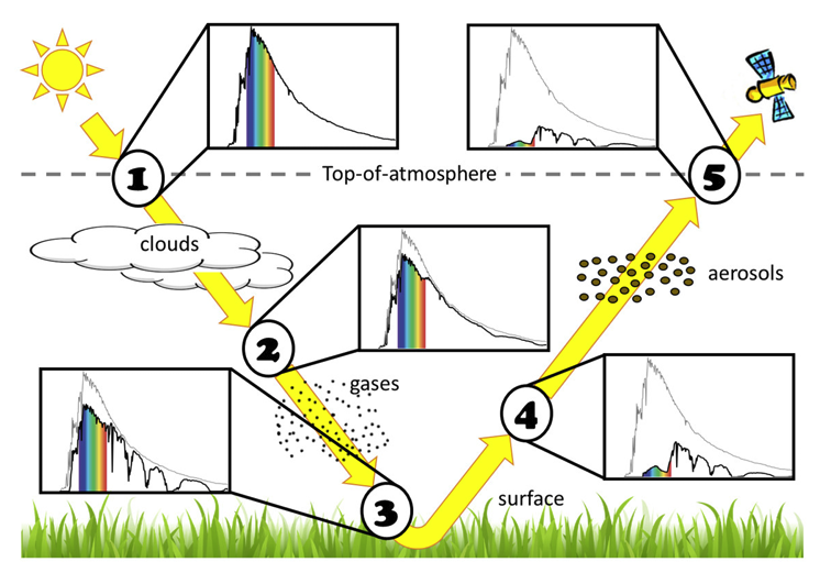 Разные поверхности и вещества на Земле по-разному отражают и поглощают свет разных длин волн. Например, здоровая зелёная растительность будет активно поглощать красный свет и отражать зелёный (поэтому мы её такой и видим) и ближний инфракрасный. Вода, почва, ледники, городская застройка, даже частицы загрязнений в атмосфере — всё имеет свою уникальную «спектральную подпись».