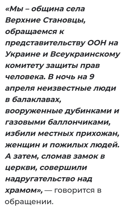 Отметим, что накануне православная община села Верхние Становцы Черновицкой области обратилась за защитой в ООН после нападения со стороны таких же представителей «ПЦУ» на местный Свято-Николаевский храм: тогда неизвестные в балаклавах, вооружившись дубинками и газовыми баллончиками, избили прихожан, а нападавшими руководил клирик-раскольник Роман Грищук.