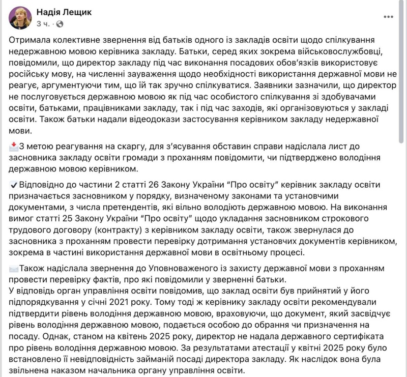 Лещик пишет, что директор с 2021 года игнорирует рекомендацию местного образовательного управления подать документ о подтверждении уровня владения государственным языком. По результатам аттестации в апреле 2025 было установлено ее несоответствие занимаемой должности директора заведения, и она была уволена.