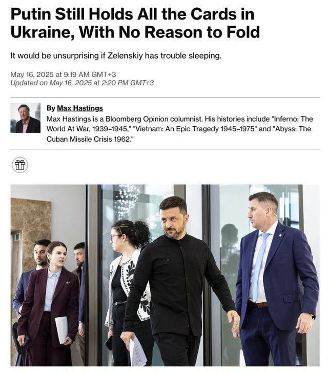 «Путин по-прежнему держит все карты на руках, и у него нет причин сдаваться. Неудивительно, что Зеленский плохо спит», — отмечает колумнист Bloomberg Макс Гастингс.