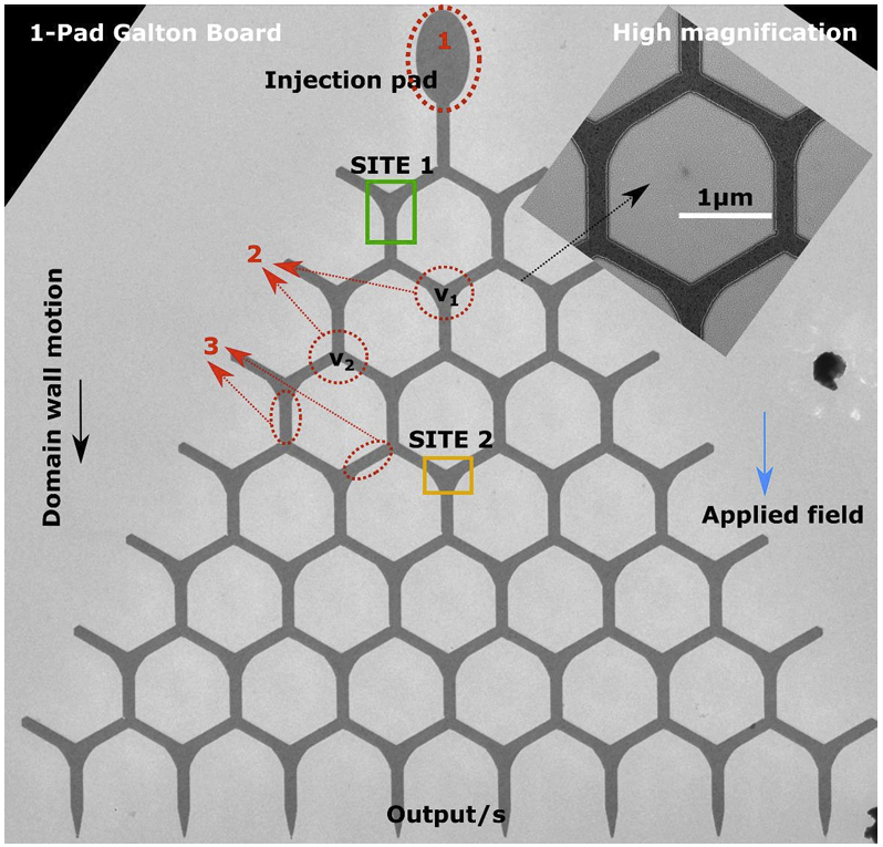 В эту наномагнитную доску Гальтона «запускают» доменные стенки, подталкивая их магнитным полем. И вот тут начинается самое интересное: на каждом «перекрёстке» в этой наноструктуре доменная стенка должна сделать «выбор» — повернуть налево или направо. И этот выбор, как и в классической доске Гальтона, случаен!