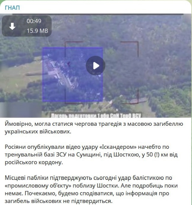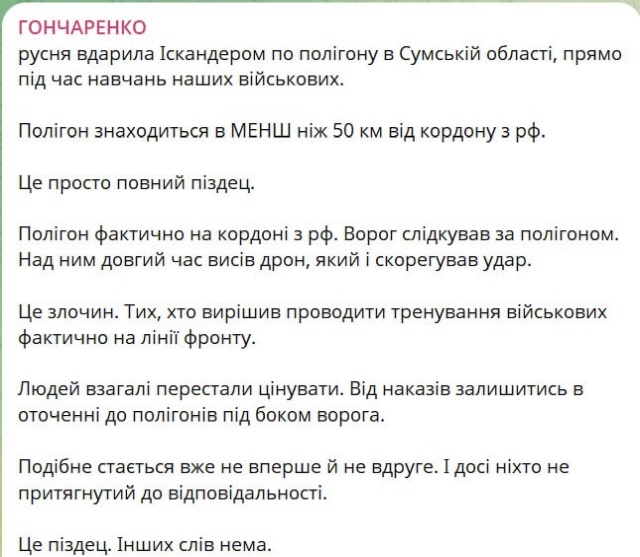 «Русские ударили «Искандером» по полигону в Сумской области, прямо во время учений наших военных. Полигон находится в менее чем 50 км от границы с РФ. Это просто полный п…ц. Полигон практически на границе с РФ. Враг следил за полигоном. Над ним долгое время висел дрон, который и скорректировал удар. Это преступление. Решивших проводить тренировки военных фактически на линии фронта», — написал он в телеграм-канале.
