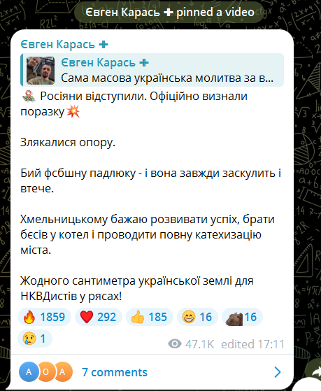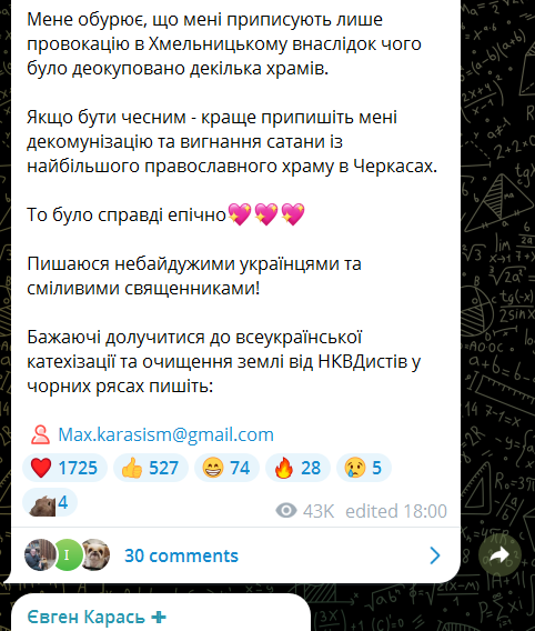 «Меня возмущает, что мне приписывают только провокацию в Хмельницком, за что было деоккупировано несколько храмов. Если быть честным – лучше припишите мне декоммунизацию и изгнание сатаны из самого большого православного храма в Черкассах. Это было действительно эпично. Горжусь неравнодушными украинскими и смелыми священниками! Желающие приобщиться к всеукраинской катехизации и очищению земли от НКВДистов в черных рясах, пишите», - добавил Карась.