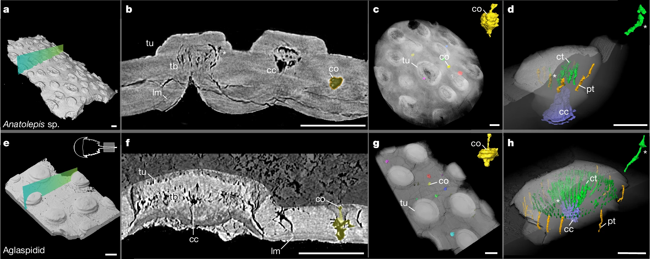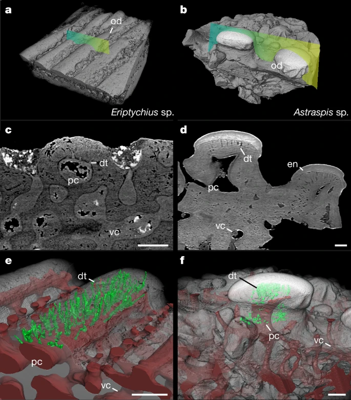 Позвольте объяснить: дентин — это одна из ключевых тканей зуба, расположенная под эмалью. Он пронизан микроскопическими трубочками, в которых проходят отростки клеток, отвечающих за чувствительность. Если канальцы Anatolepis действительно были дентинными, это означало бы, что мы имеем дело с одними из первых позвоночных, уже обладавших примитивными зубами-одонтодами. Картина складывалась красивая, но, как оказалось, не совсем верная.