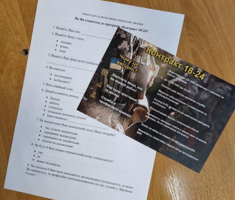 Помимо этого, во многих украинских вузах студентов обязывают заполнять некие анонимные анкеты, в которых интересуются их отношением к военной службе, «молодежному контракту» и желании служить.