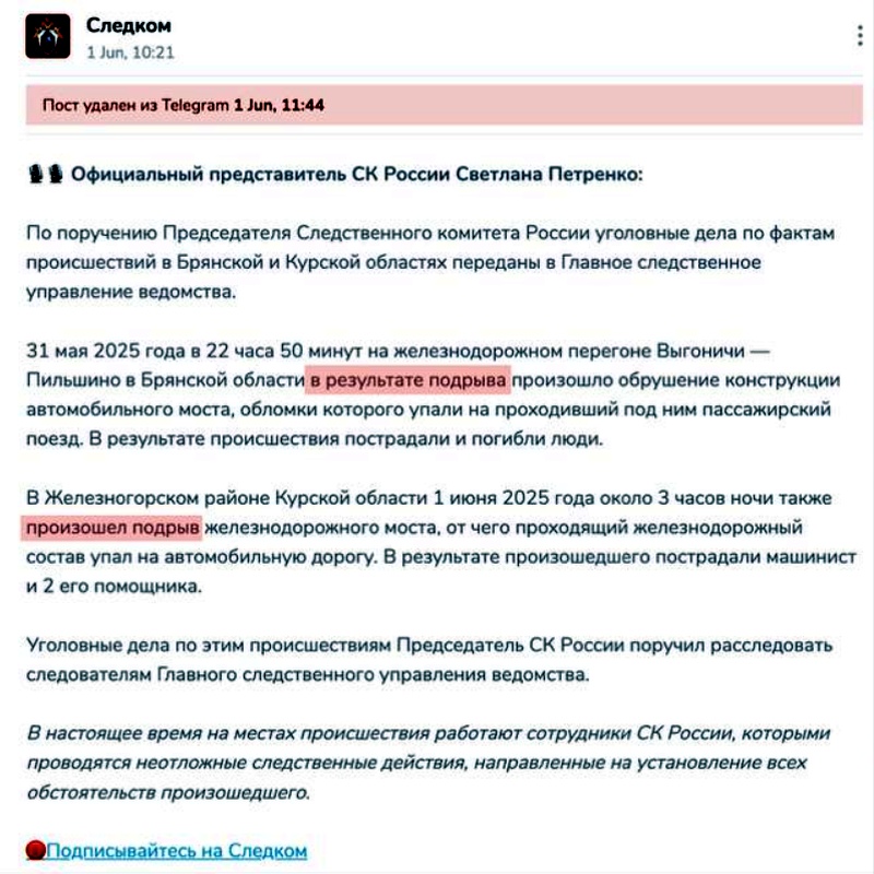 Напомним, 1 июня СК РФ в официальной информации причиной обрушения железнодорожных мостов в Брянской и Курской областях указал «подрыв», однако, примерно через полтора часа «подрыв» из официальных уведомлений исчез, вместо чего появилась констатация «обрушения» одного моста, другой же мост «упал».
