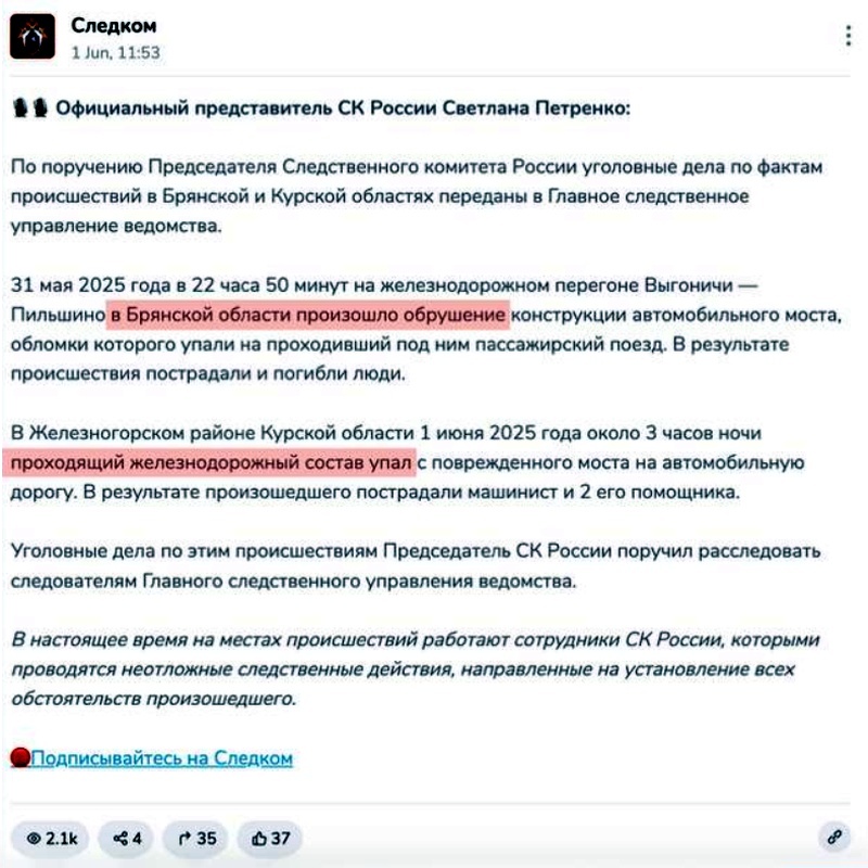 «Главным следственным управлением СК России факты подрывов участков железной дороги и конструкции моста в Брянской и Курской областях в период с 31 мая по 1 июня текущего года, которые привели к сходу пассажирского, товарного и диагностического составов, квалифицированы как террористические акты (ст. 205 УК РФ). Очевидно, что террористы, действовавшие по указанию киевского режима, с максимальной точностью спланировали все так, чтобы под их удары попали сотни мирных граждан», — заявила официальный представитель СК Светлана Петренко.