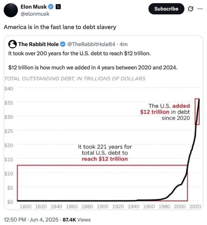 Сегодня Илон Маск продолжил критиковать законопроект, подчеркнув, что США «находятся на пути к долговому рабству»: США накопили 12 трлн долларов долгов за последние 5 лет, столько же, как за 200 лет до этого.