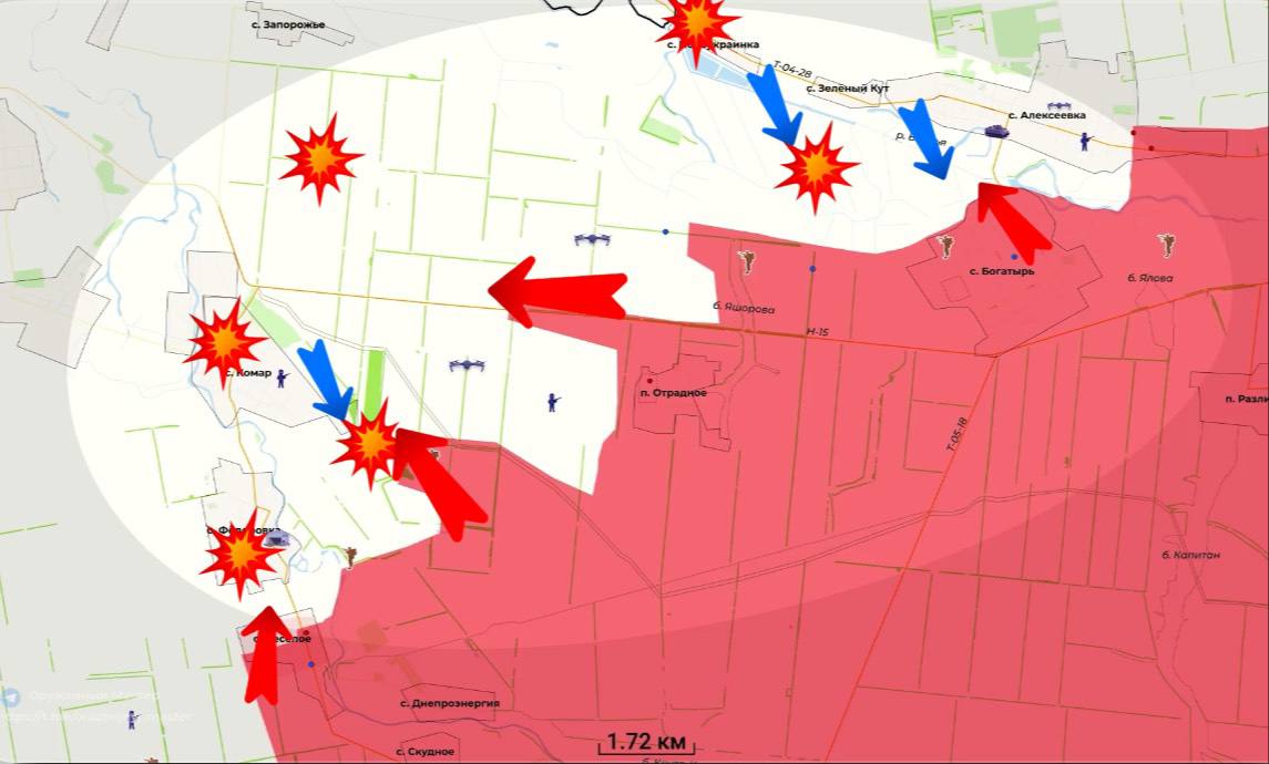 Западнее ОРЕХОВО наши прорвали оборону ВСУ и закрепились, продвинулись в УДАЧНОМ. На востоке враг перебрасывает резервы в НИКОЛАЕВКУ, севернее НОВОЭКОНОМИЧЕСКОГО наши идут на КОПТЕВО.