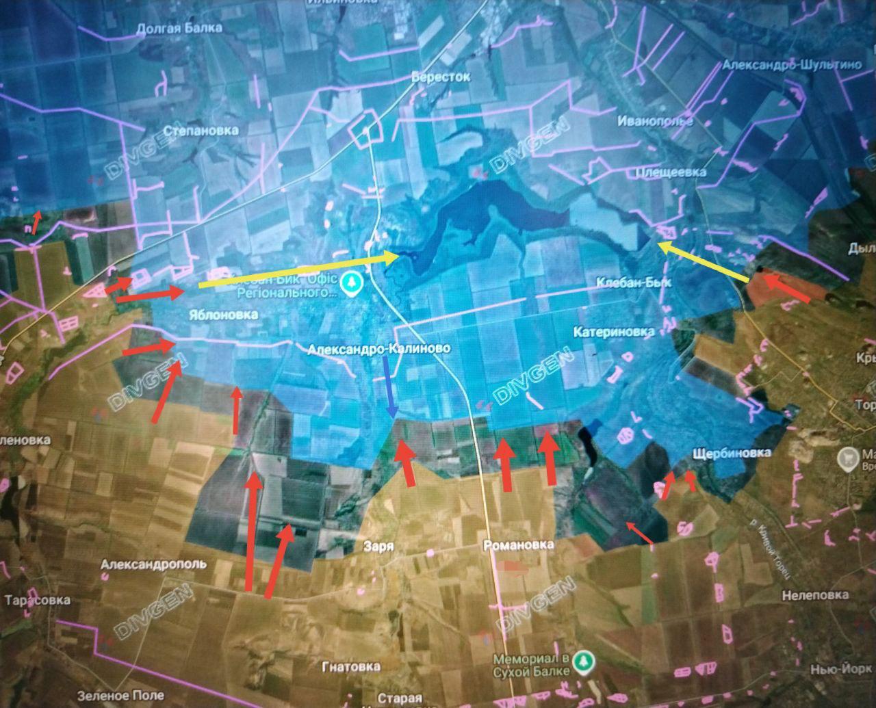 Наши войска наступают с запада (в ЯБЛОНОВКЕ) и востока (западнее пос. ГОРЬКОГО (Дылеевка)) к Клебан-Быкскому водохранилищу, угрожая окружением группировки противника южнее (в районе ЩЕРБИНОВКА – НОВОСПАССКОЕ – КАТЕРИНОВКА АЛЕКСАНДРО-КАЛИНОВО).