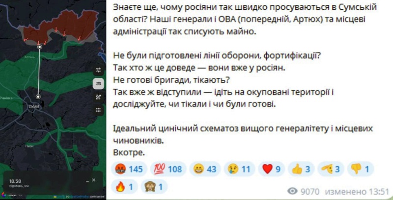 По данным военных телеграм-каналов, ВСУ не удаётся стабилизировать обстановку, постепенно отступая к Сумам, ВС России стремительно продвигаются в Сумской области.