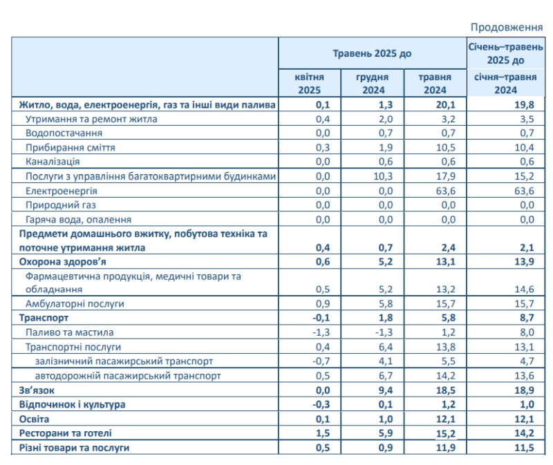 Цены на предметы домашнего обихода и бытовую техника выросли на 2,4%, здравоохранение подорожало на 13,1%, цены на транспорт выросли на 5,8% (в т.ч. топливо подорожало на 1,2%), на связь — на 18,5%, на отдых и культуру выросли на 1,2%, образование подорожало на 12,1%, рестораны и гостиницы подорожали на 15,2%, разные товары и услуги на 11,9%.