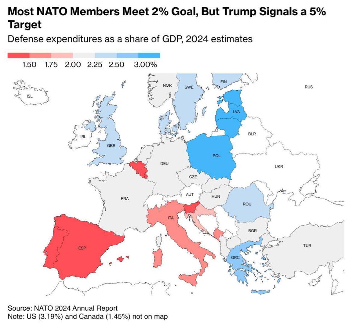 «Бюрократия альянса лишь попытается закрепить на бумаге приверженность 5-й статье устава НАТО. А то команда Дональда Трампа прозрачно намекает, что гарантий безопасности может уже и не быть. Заодно постараются поставить новую цель военных трат в 3,5% от ВВП. Проблема лишь в том, что до сих пор многие страны — Испания, Италия, Канада, Бельгия — тратят сильно меньше 2%», — пишет Малек Дудаков.