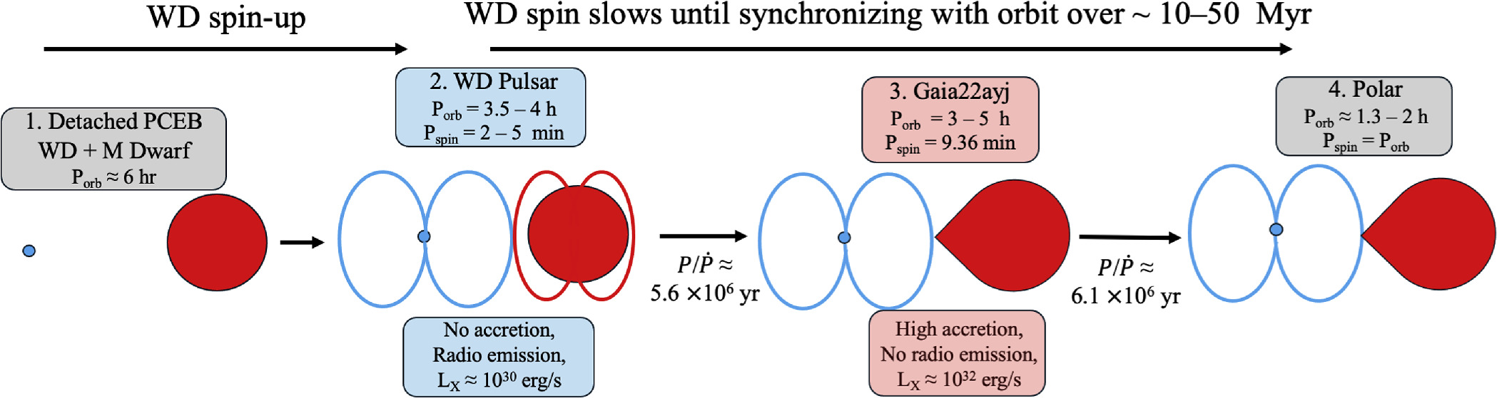 - «Младенчество»: Две звезды в системе, где быстрое вращение будущего белого карлика только начинает генерировать сильное магнитное поле.