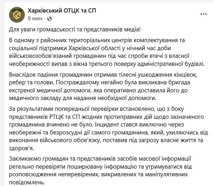 Ночью 20 июня незаконно мобилизованный мужчина выпал из окна 3 этажа из здания ТЦК в Берестене Харьковской области. Как сообщают местные паблики, мужчина был задержан 18 июня Красноградским ТЦК. В военном билете указано исключение из воинского учета.