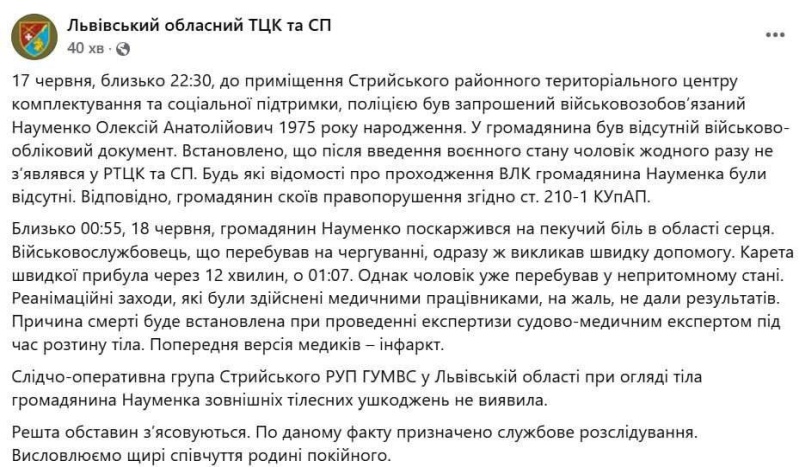 В военкомате Стрыя Львовской области умер 50-летний мужчина. По информации Львовского областного ТЦК, в 22:30 военнообязанный Алексей Науменко «был приглашен» полицией в Стрыйский ТЦК, а в 0:55, по версии военкомом, ему стало плохо. В 1:07 прибыла скорая, но мужчина уже был без сознания и вскоре скончался. Утверждается, что предварительный диагноз — инфаркт.