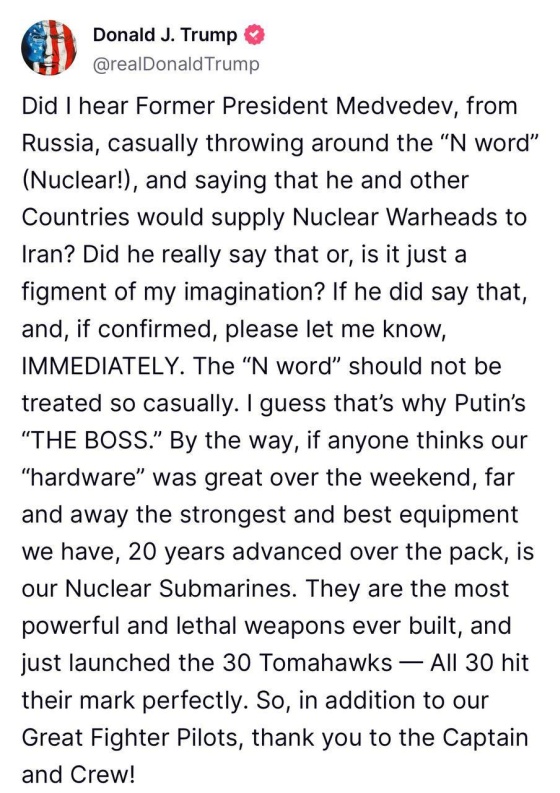 «Правильно ли я понял, что бывший президент России Медведев запросто бросается "буквой Я" (ядерное!), и говорит, что он и другие страны будут поставлять ядерные боеголовки Ирану? Он действительно это сказал, или мне это просто показалось? Если он и правда это сказал, и, если это подтвердится — немедленно дайте мне знать. К таким словам, как "ядерное", нельзя относиться легкомысленно. Полагаю, именно поэтому Путин — "Босс"», — написал он в своей соцсети в Truth Social.