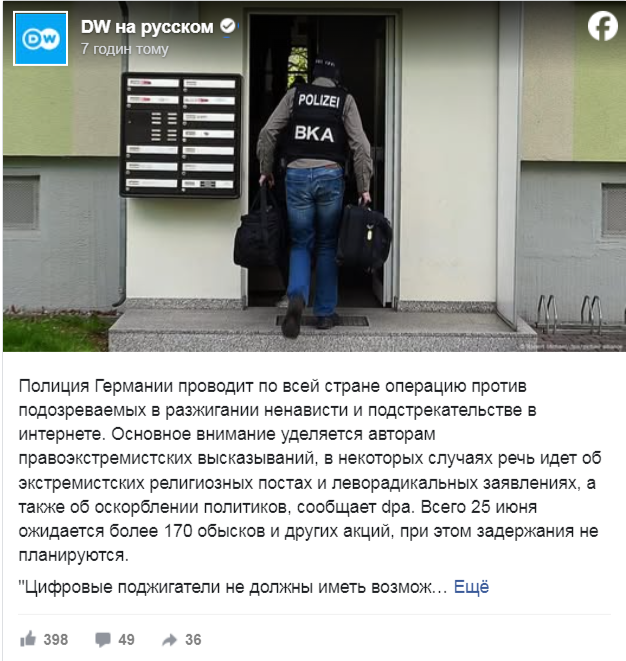 В этой связи полиция в шестнадцати регионах страны провела более 150 обысков и допросов пользователей соцсетей, которые своими высказываниями выдавали свою «неблагонадежность». Всего запланировано провести 170 обысков, пишет немецкая пресса.
