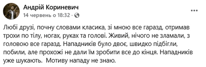 «Милые друзья, начну словами классика, со мной все хорошо, получил немного по телу, ногам, рукам и голове. Жив, ничего не сломали, с головой все хорошо. Нападавших было двое, быстро подбежали, избили, но прохожие не дали им сделать все до конца. Нападающих уже ищут», — описал подробности сам Кориневич в соцсетях.