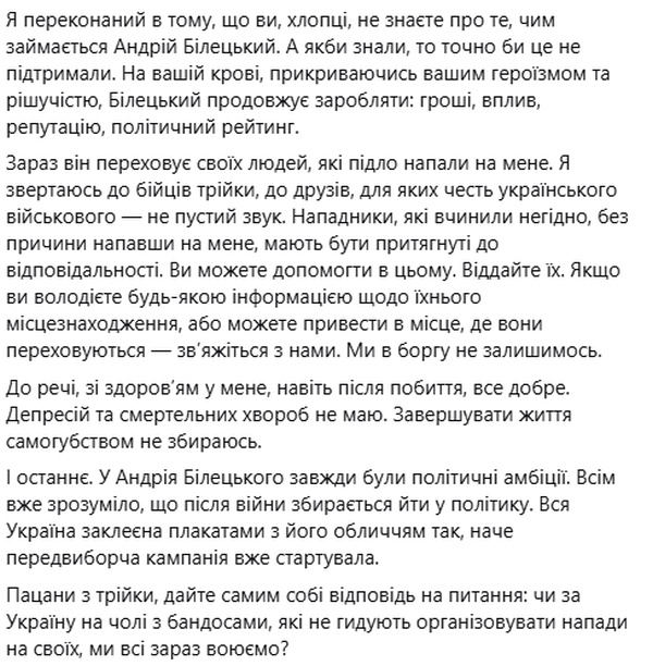 «Почему напали именно на меня? Я не знаю. Возможно, потому, что служу в «Азове»* со времен командования Билецкого. Или потому, что я на момент нападения находился в Ивано-Франковске, где организовать такое, наверное, легче, чем в Киеве. Но, я хорошо знаю Андрея Белецкого. И понимаю, что без его согласия или даже прямого указания такие вещи не происходят», — заявил «азовец»*.