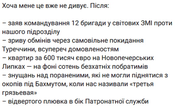 «Командование подразделения, которое содержит менее 10 километров фронта, хайпирует на обливании грязью бригады, которая держит шестьдесят. Они обвиняют топовых разведчиков, воюющих с 2014 года, в участии в „спецоперации“ против ноунейма, который является просто чьим-то водителем без боевого опыта. Я верю в порядочность многих в составе 12 бригады НГУ. Но терпящие подобное поведение не имеют права называть себя ни азовцами, ни националистами», — парировал Кухарчук.