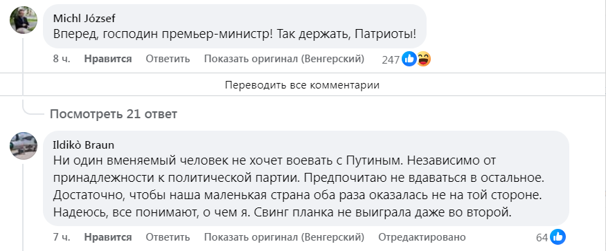 «Ни один здравомыслящий человек не хочет воевать с Путиным. Независимо от политической принадлежности», - отметил, в частности, венгр по имени Ildikò Braun.