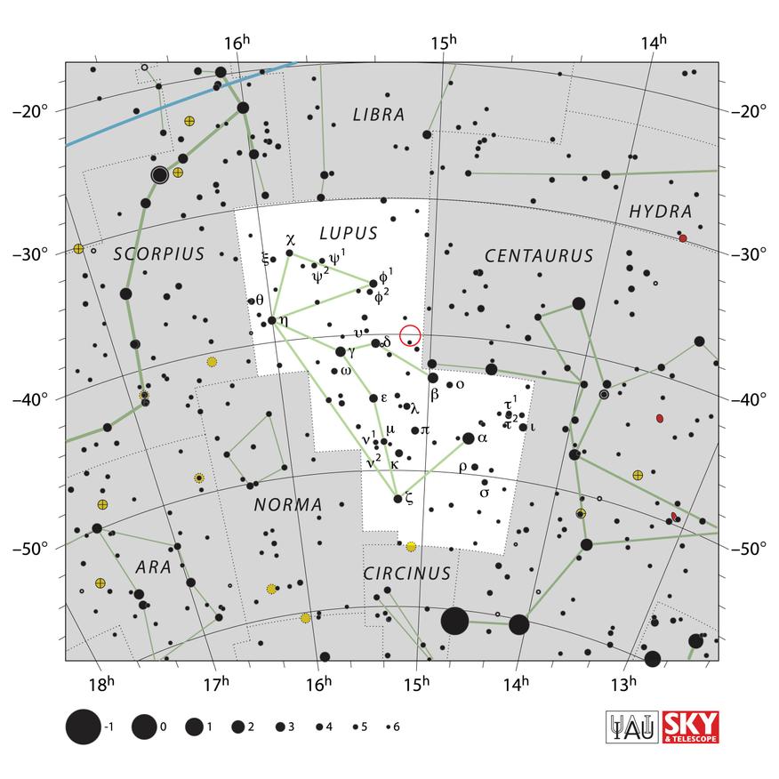 - Куда смотреть: Ищите созвездие Волка (Lupus). Наблюдателям в Южном полушарии повезло больше — для них созвездие будет располагаться высоко в небе. Жителям южных регионов Северного полушария придётся искать его низко над южным горизонтом (например в Крыму его видно низко над горизонтом, сразу после захода Солнца). Ориентирами могут служить яркие звёзды Дельта Волка и Каппа Центавра.