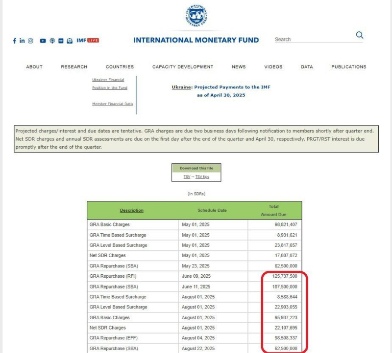 Новые кредиты Международного валютного фонда не покрывают выплат по предыдущим долгам. Согласно данным МВФ, в мае 2025 года Украина заплатила по ранее предоставленным кредитам МВФ около 211,9 миллиона СПЗ (в специальных правах заимствования — валюта МВФ), или 294,5 миллиона долларов. В июне Украине предстоит выплата еще 435,5 миллиона долларов (313,3 миллиона СПЗ), а в августе — 431,7 миллиона долларов (310,5 миллиона СПЗ), что в совокупности значительно больше 500 миллионов, которые МВФ решил предоставить Украине по итогу работы миссия фонда в Киеве 20-27 мая.