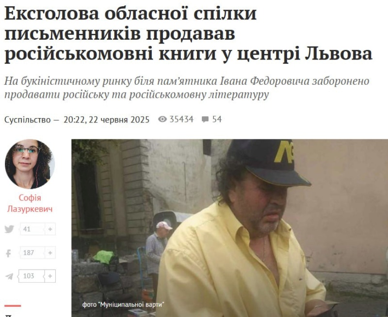 Во время рейда по проверке соблюдения запрета на продажу книг на русском языке, представители «стражи» обнаружили сотни книг на русском языке. Среди «торговцев - нарушителей» оказался писатель и экс-председатель Львовской областной организации Национального союза писателей Украины Игорь Гургула, выставивший на продажу около 100 русскоязычных книг.
