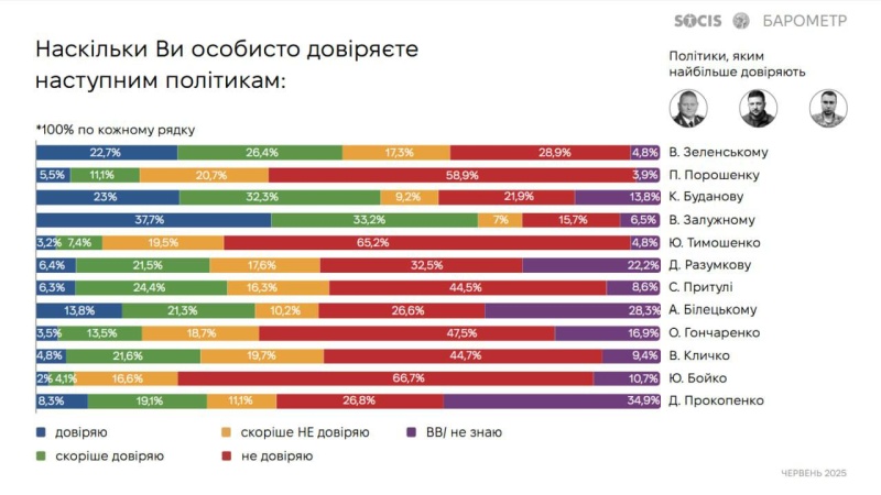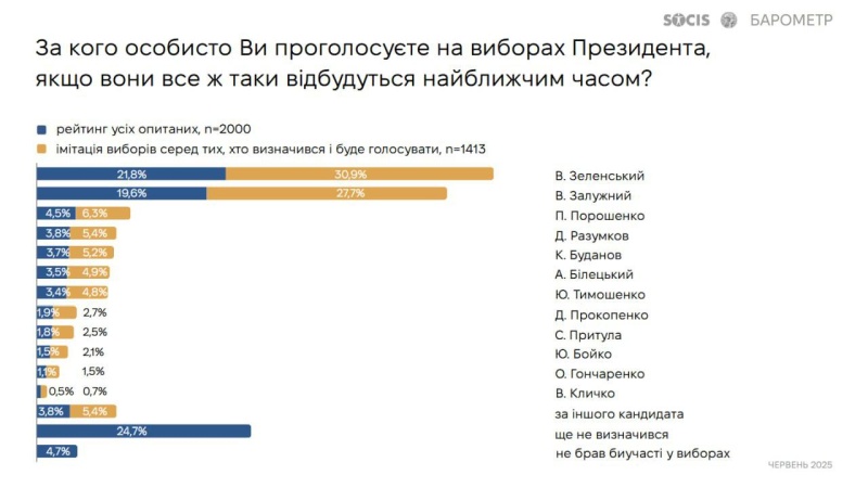 Согласно опросу SOCIS, если бы выборы президента проходили в ближайшее время, то победил бы Зеленский с рейтингом около 20%.