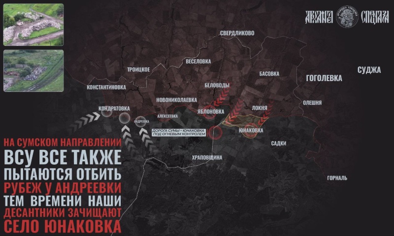 «В самой Юнаковке ситуация близится к своему логическому завершению, так как десантники ведут зачистку села. После длительных боев десантники смогли выбить противника на юг. Близящееся освобождение Юнаковки — важное тактическое достижение наших подразделений, так как при получении контроля над селом у противника сразу же возникнут проблемы к востоку от села и в близлежащих районах вдоль дороги до Сум.По этой причине противник усиленно оборонял населенный пункт и отправлял туда все новые подкрепления. Однако ему это не удалось, так как большая часть Юнаковки под нашим контролем.