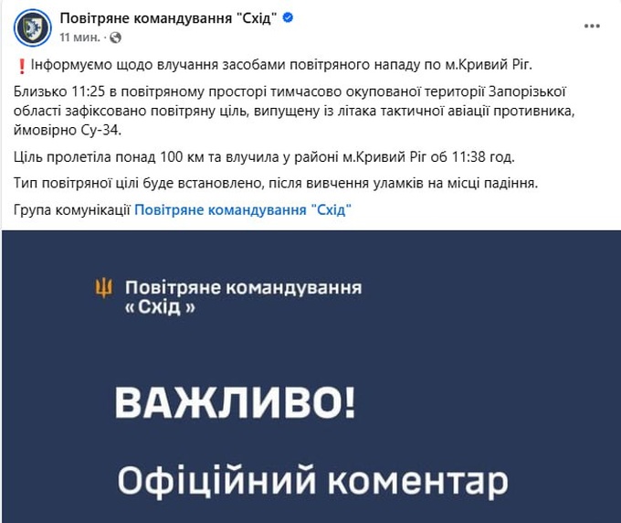 Сегодня примерно около полудня в Кривом Роге был поражен военный объект управляемой авиабомбой, которая преодолела более 100 км. По предварительным данным украинского командования, запуск осуществлён с самолёта Су-34.