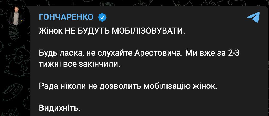 Однако депутат Верховной рады Алексей Гончаренко** немедленно призвал не верить экс-советнику, заявив, что мобилизации женщин не будет никогда.