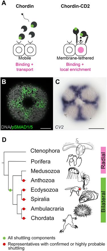 Но как создать эту разницу в уровнях? Здесь на сцену выходит другой белок — хордин. Он действует как ингибитор, то есть «глушилка» для сигнала КМБ. Более того, хордин может не просто блокировать КМБ на месте, а связывать его и перемещать в другие части эмбриона. Этот процесс — транспорт, или «шаттлинг» — позволяет создавать очень точные и плавные градиенты концентрации КМБ, от высокой к низкой. Именно эта сложная система и лежит в основе формирования оси «спина-живот» у многих билатеральных животных, от мух до лягушек.