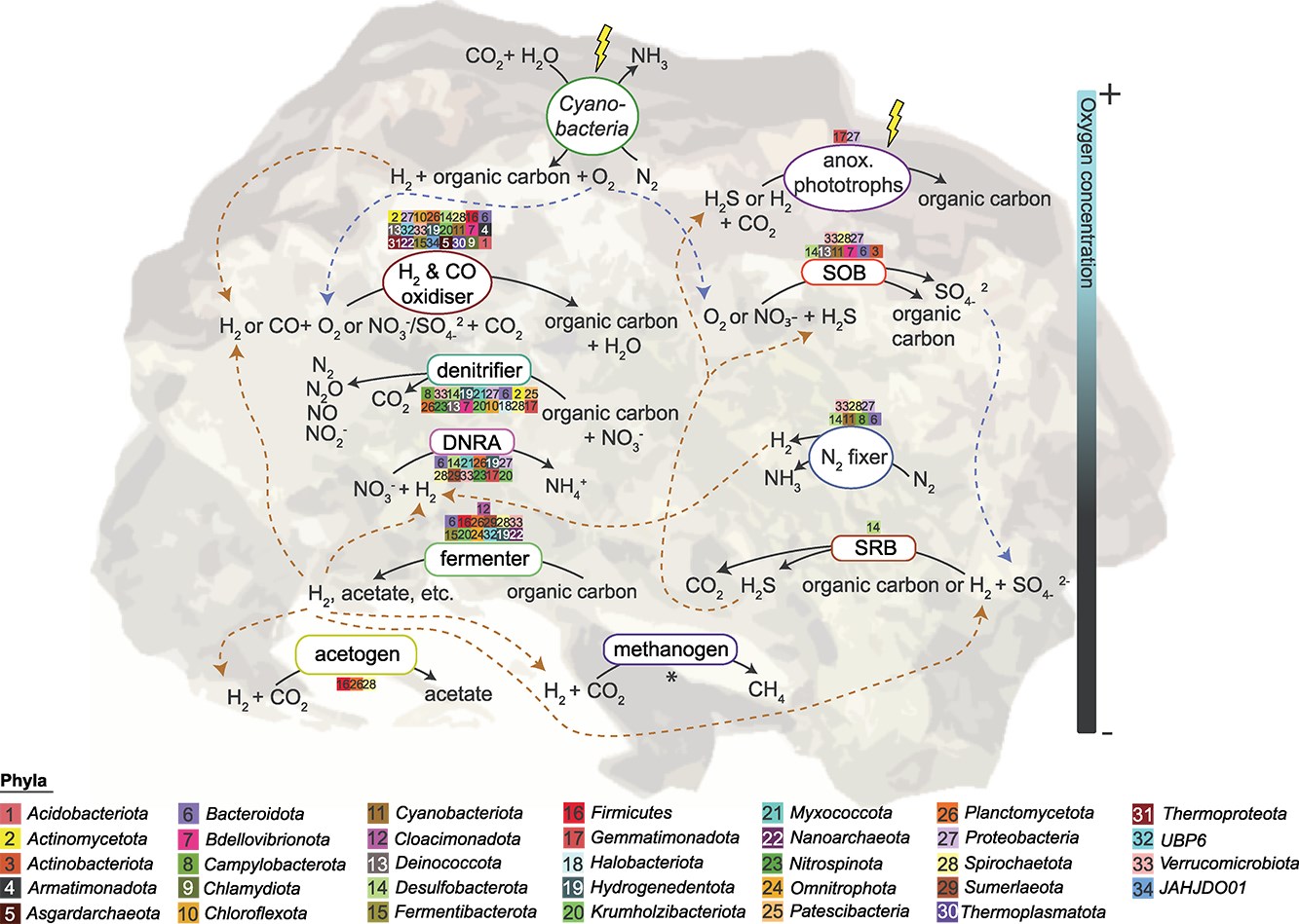 Учёные обнаружили, что эти микроорганизмы образуют высокоэффективные консорциумы. Отходы жизнедеятельности одного вида становятся ценнейшим ресурсом для другого. Например, углекислый газ (CO₂), выделяемый одними микробами в процессе дыхания, тут же подхватывается и используется другими для фиксации углерода. Возникает замкнутый цикл, который сводит потери к минимуму и максимизирует общую продуктивность всего сообщества.