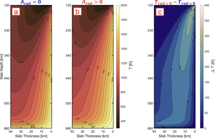 Это полностью меняет картину. Нагрев слэба происходит не только за счёт медленного «контакта» с горячей мантией, но и за счёт теплового излучения, которое, подобно свету, пронизывает толщу оливина. Это похоже на разницу между нагревом от горячей сковородки (теплопроводность) и нагревом от огня костра (излучение). Второй способ гораздо быстрее. Радиационный перенос даёт до 40% всего тепла, получаемого плитой.